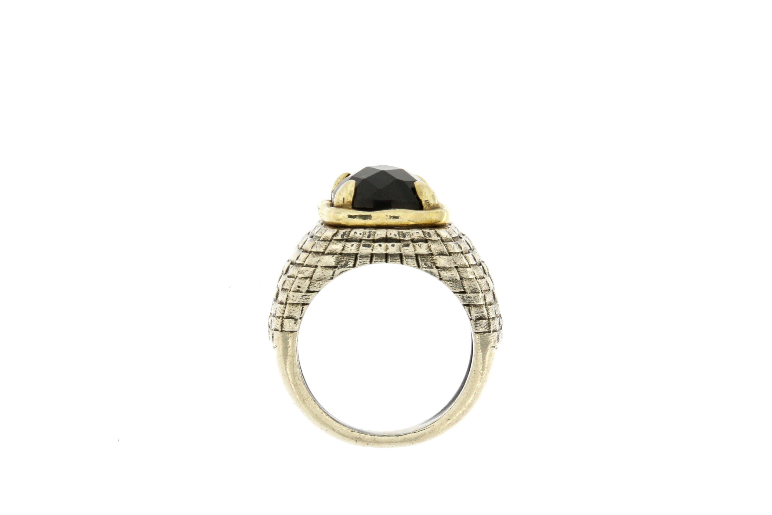 Anello unisex in argento 925 invecchiato interamente inciso a mano con il motivo ‘paglia’ e castone in oro giallo 9kt con griffe a punta che tengono una pietra naturale ONICE.